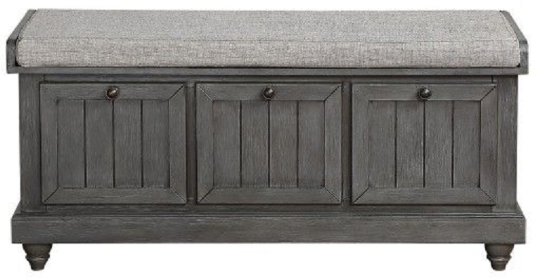 The Woodwell Collection will be a functional addition to your home. False drawer fronts serve as the base for this lift-top storage ottoman. A neutral tone grey padded seat provides a comfortable spot to sit as you prepare for your daily outings. Knob hardware create contrast to the antique gray distressed finish.