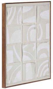 Shadowed tones add depth and dimension to the collage-like squares, while a neutral color palette and irregular shapes offer a softness to the sharp shapes—a remarkable abstract piece expertly finished with a solid pine frame.