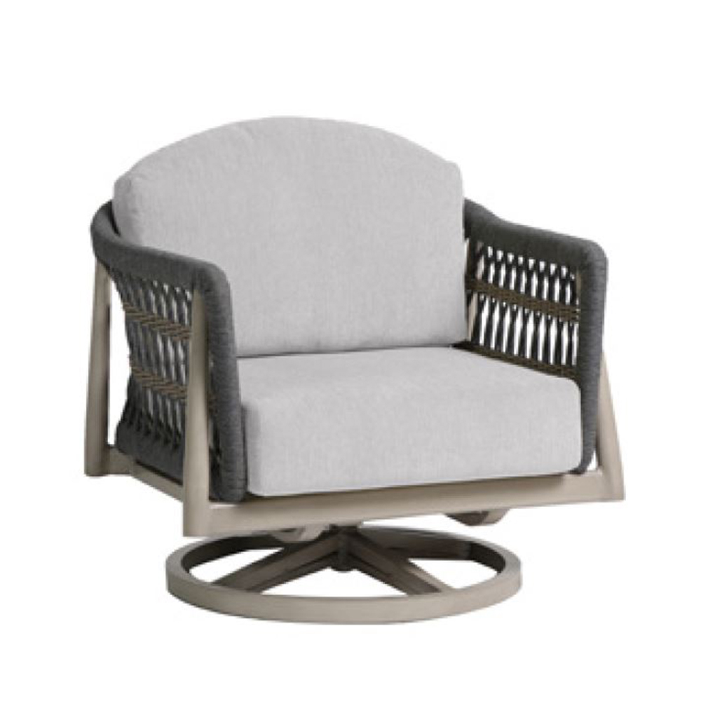 The Coconut Grove swivel rocker features a powder coated aluminum frame with hand-brushed finish, two toned weaved back and sides and swivel base. Plush back and seat cushions available in fabric choices.Read More